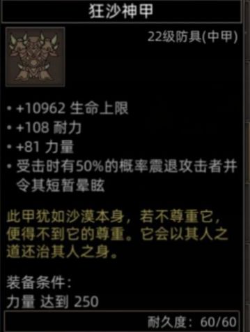 V1.0.7版本,装备需要250点力量,1周目是非常非常难达到这个装备的穿戴条件的,最少2周目,并且要刷多次雪山图书馆。