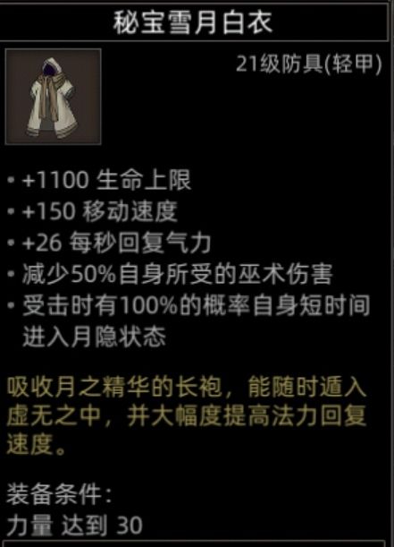 脆皮保命防具中的极品,有移速、和超高的气力回复、50%的巫术减伤,最重要的是受到攻击就隐身一段时间。