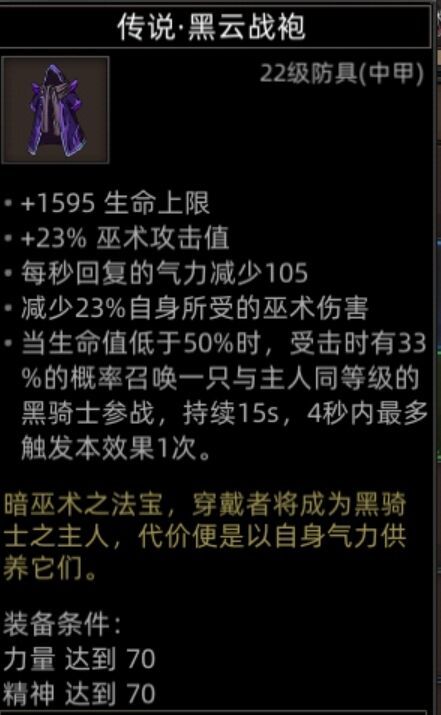 防具中数一数二的存在,50%的巫术减伤,25%的CD减少,玩巫师穿上就是行走的巫术炮台。