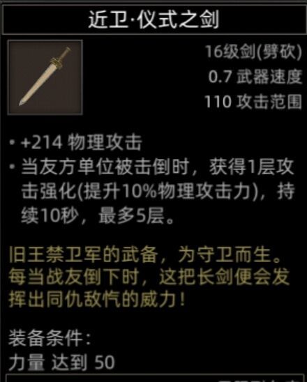 如果未生效bug被修复,该装备是前排NPC队友的可选毕业装备之一。