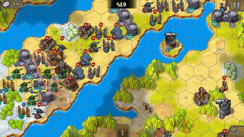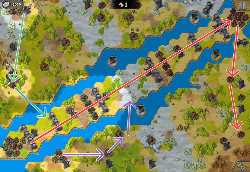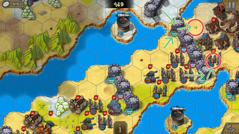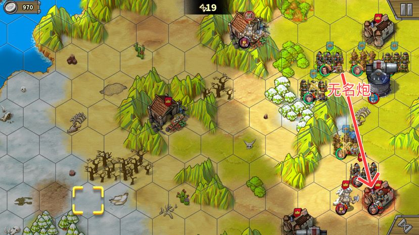 ‌很多攻略都说上路造步兵守,我多次实践的经验是,不守是最大的防守。上路塔旁边这个弓将有治疗技能,有一次我造了很多步兵守这个红圈,结果造的兵全给这个弓将喂怒气了。而且有兵守会吸引很多敌人过来,反而守不住,没兵守敌人会去打中间那个炮塔,最后被炮塔打死,上下两马厩不会被占,最后几回合造个骑兵占红圈即可,屡试不爽。