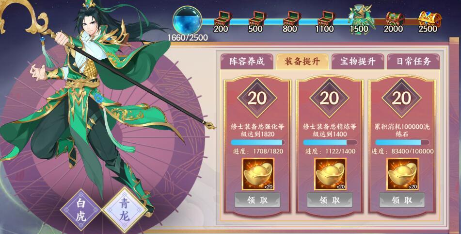 1.时装活动 这个任务的话,主要是分4点,阵容养成、装备提升、宝物提升、日常任务,很多玩家都在说围绕装备提升和宝物提升这两点去做,获得青龙时装是没有问题的,其次还有一点小技巧就是阵容养成的修士觉醒,注意这里说的是觉醒总等级,就是有的你不上阵的修士也可以计算在内,这个任务获得青龙时装没任何问题,但是白虎的话估计就需要小虫一点。