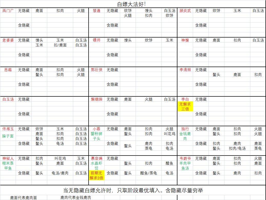 但是若没出隐藏则无法同时满足鹿肉(2/小时)和没氪蟹黄豆腐的蟹粉汤包(8/小时),此时只有买蟹黄豆腐,预留面粉或氪面粉材料包来消耗螃蟹。