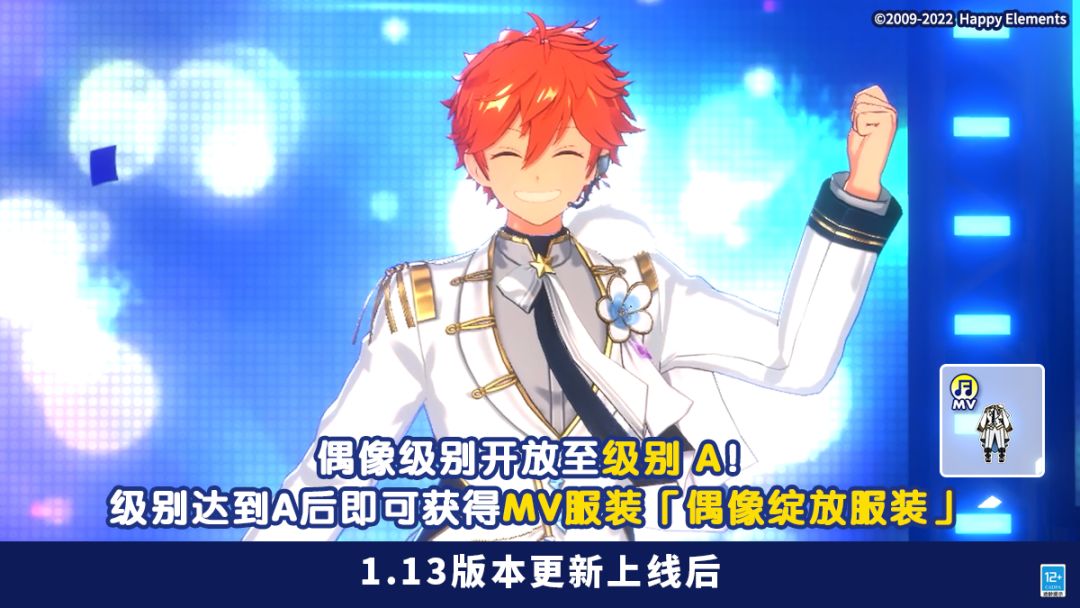 1.13版本更新后,游戏内偶像级别将开放至级别A!达成级别A后即可获得MV服装「偶像绽放服装」