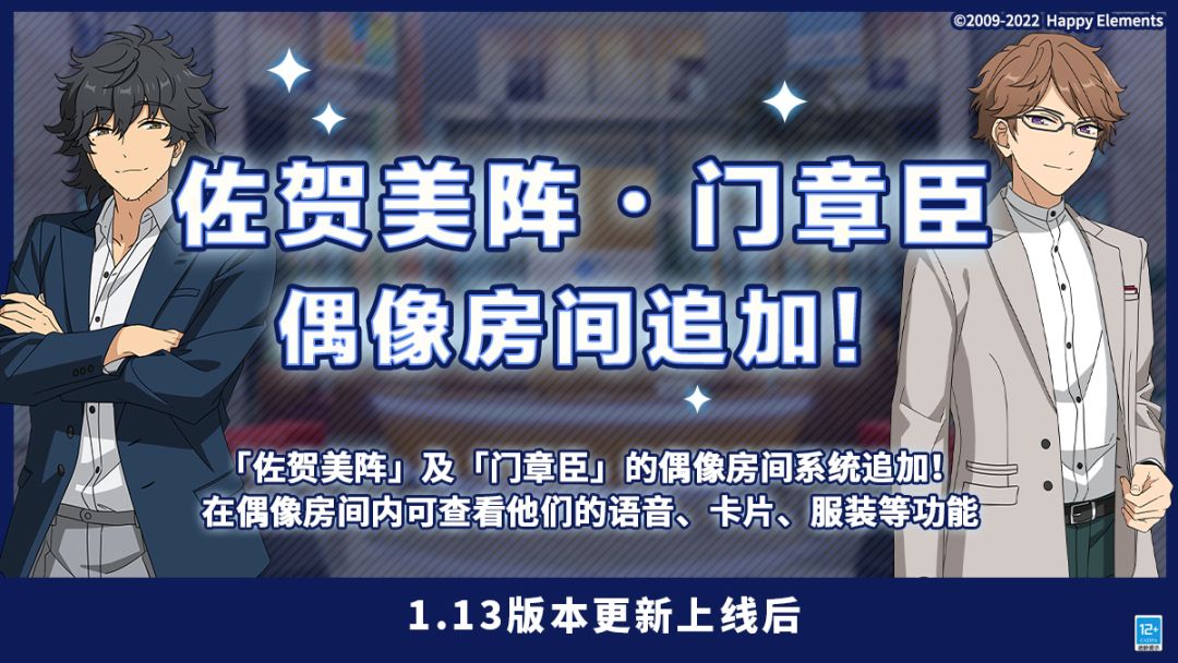 1.13版本更新后,游戏内将追加佐贺美阵与门章臣的【偶像房间】!
