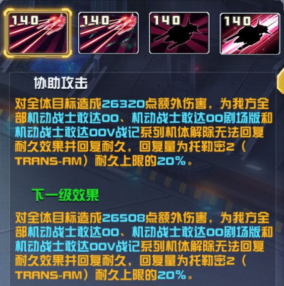 对全体目标造成26320点额外伤害,为我方全部机动战士敢达00、机动战士敢达00剧场版和机动战士敢达00V战记系列机体解除无法回复耐久效果并回复耐久,回复量为托勒密2(TRANS-AM)耐久上限的20%。