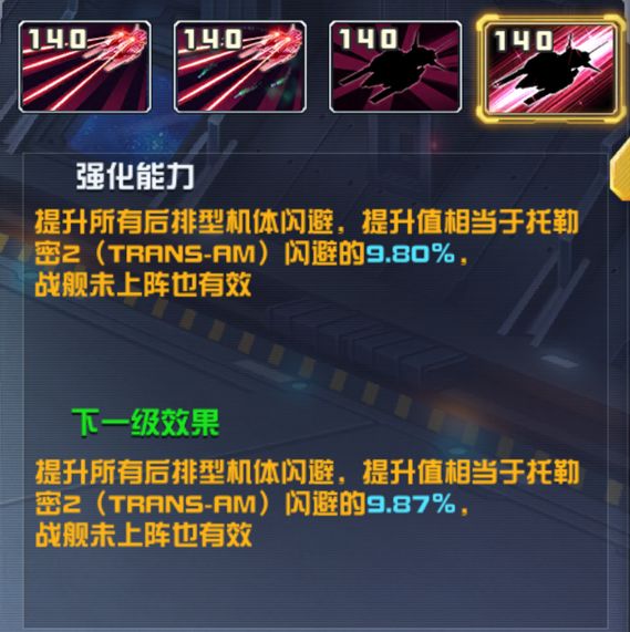 提升所有后排型机体闪避,提升值相当于托勒密2(TRANS-AM)闪避的9.80%,战舰未上阵也有效。