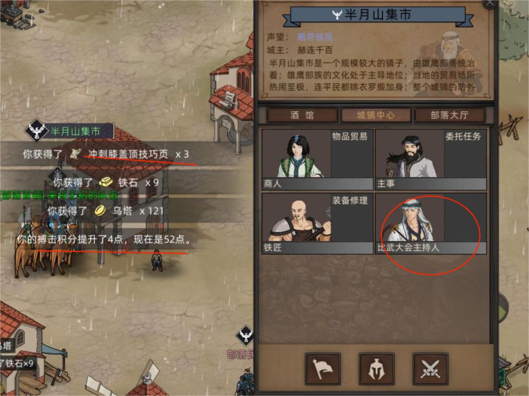 每个城市的酒馆都可以进行搏击,但必须有摔跤手在。点击这个啤酒图标就可进行搏击。