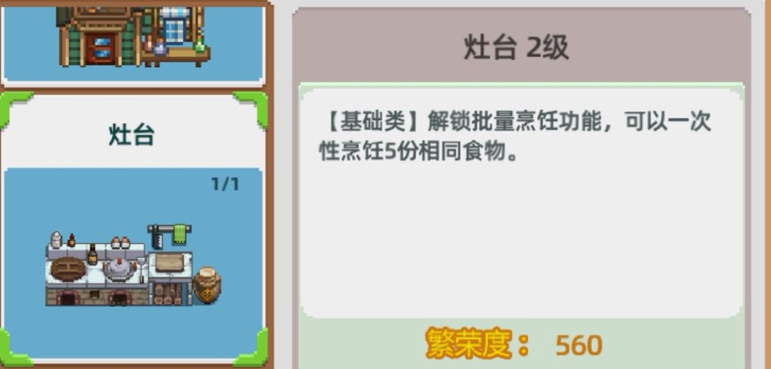2级灶台可以一次烹饪5份相同的食物(二级灶台需要找马达升级)
