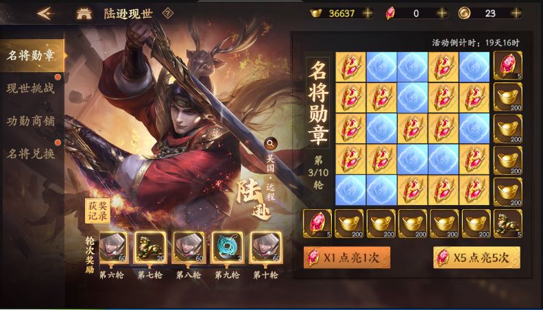 名将现世——陆逊 陆逊现世已经将近一周的时间了,下面小编简单来说下关于陆逊的一些玩法,陆逊是名将现世活动里面所获得的,主要是以抽奖和蒋勋兑换两种方式去获得,其中抽奖一共十轮: