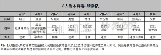 唐晨+暗三是这个阵容核心输出,且【暴雨梨花针】有9段攻击的特点,可以帮助我们更快的积累100段的伤害要求御风在这里既可以主动使用【暴雨梨花针】来帮助积累100段攻击数,同时还可以被动利用风月增伤,提升部分玩家在击杀boss时的速度白沉香+降珠是双拉组合在这种需要抢回合数的副本中还是非常好用的,另外如果可以触发【幻境智慧】魂骨的20星(非24星)套装效果的话,我们的通关回合数还会更短波赛西+胡列娜在这里是为了被动增伤,另外胡列娜的1技能(8段攻击)兼具了主动使用与被动无消耗使用的特点,利用这些特点,胡列娜也是我们能快速积累满100层攻击段数的关键辅助最后的奥斯卡则有点像是凑数的,毕竟这个副本8人上阵的话可以额外获得积分,不过奥斯卡的补充魂力能力还是可以帮助我们更频繁的使用技能