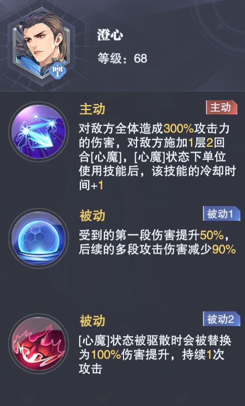 受到的第一段伤害提升50%,后续多段伤害降低90%群体攻击给我方施加的【心魔】状态在被驱散时会提升我方100%的伤害提升,持续1次攻击