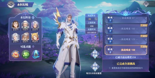 在5个boss副本结束后,焚城危情外传还会开启一个叫做“永恒幻境”的爬塔玩法,这个玩法需要我我们不断的击败AI控制的PVP阵容来提升层数,而越快击败对手提升的层数则越多,并且每关会有3个随机的buff状态供我们选择,每次挑战可以打4次,通关后以最后一层的层数作为成绩记录,且重置挑战后上次最后一关的层数也会作为我们新一轮挑战的起始层数。(每天可免费重置1次,付费重置2次,第一次付费价格100钻石,第二次付费价格200钻石,活动持续4天,每天的5:00会自动重置1次)