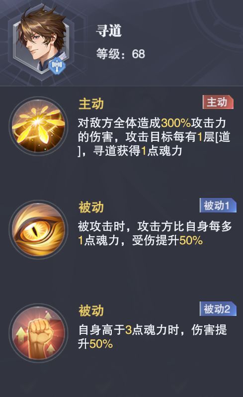 问道拥有非常不俗的获取魂力能力,且自身魂力高于3点时会有伤害的提升在攻击问道时,我方魂力每比他多出1点便可以增伤50%