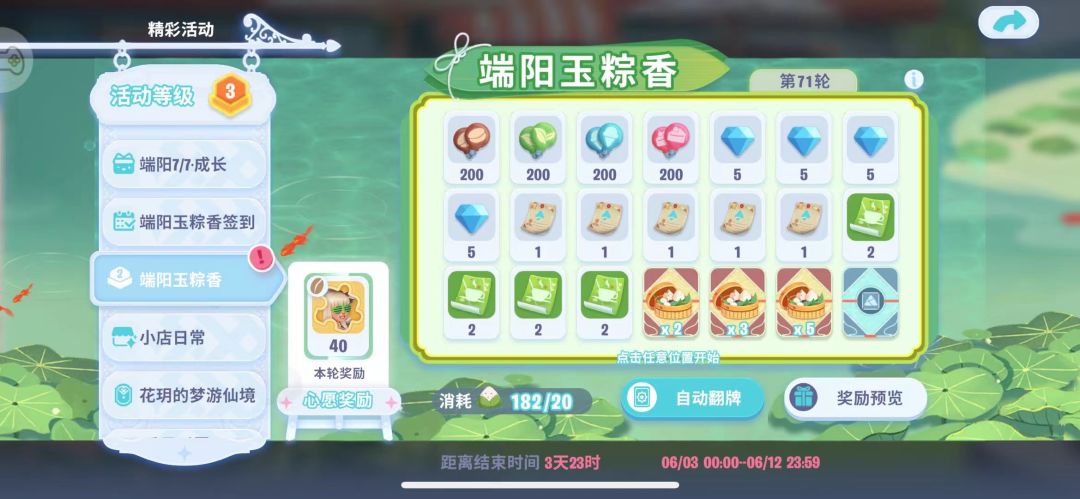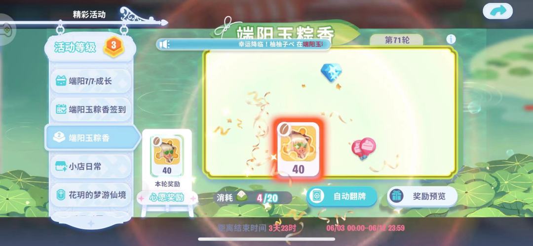 最后是用获得的道具在奖池中进行翻牌,20个道具翻一次,保底18次(360个道具)翻到,也有一次就翻到的奖励牌直接进入下一轮的,但平均下来正常区间一般8-12次能翻到。