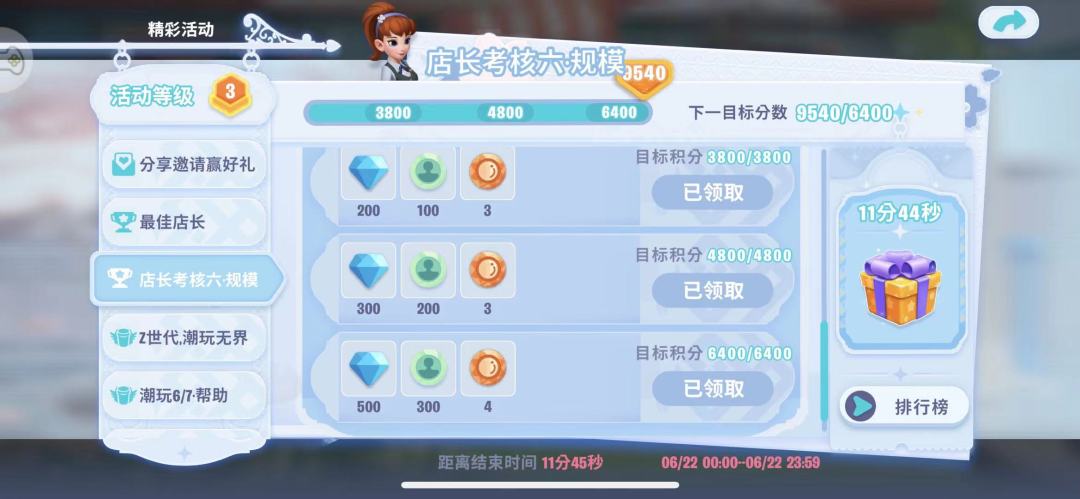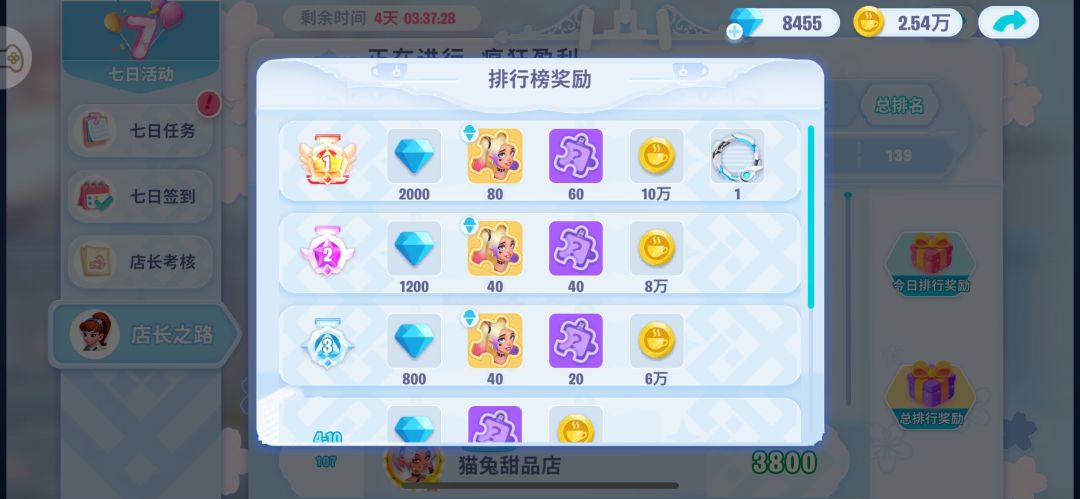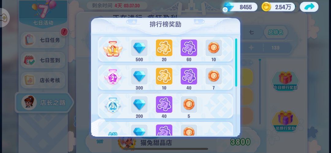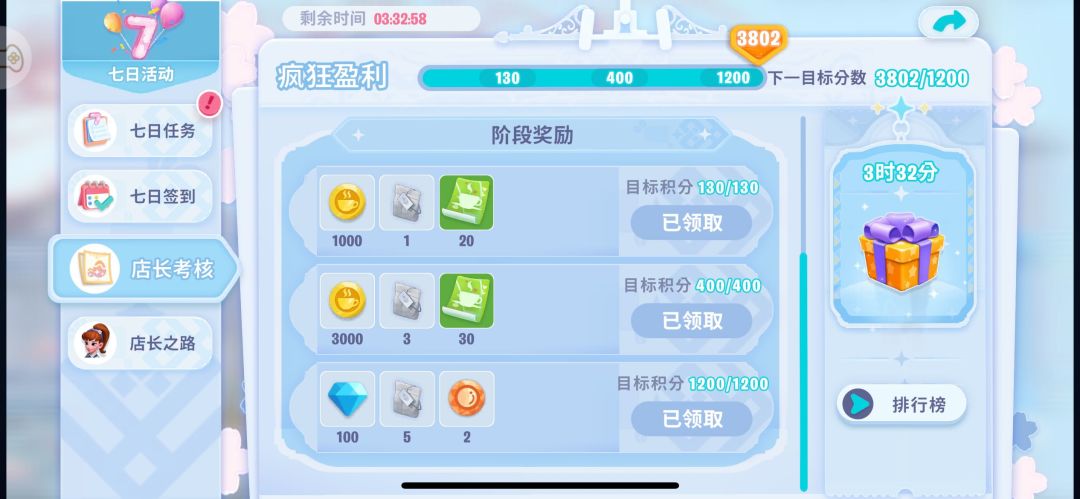 另外就算不冲榜,店长考核的奖励要求积分也是不低的,如果不屯资源,活动期间不氪金很难拿完考核奖励。