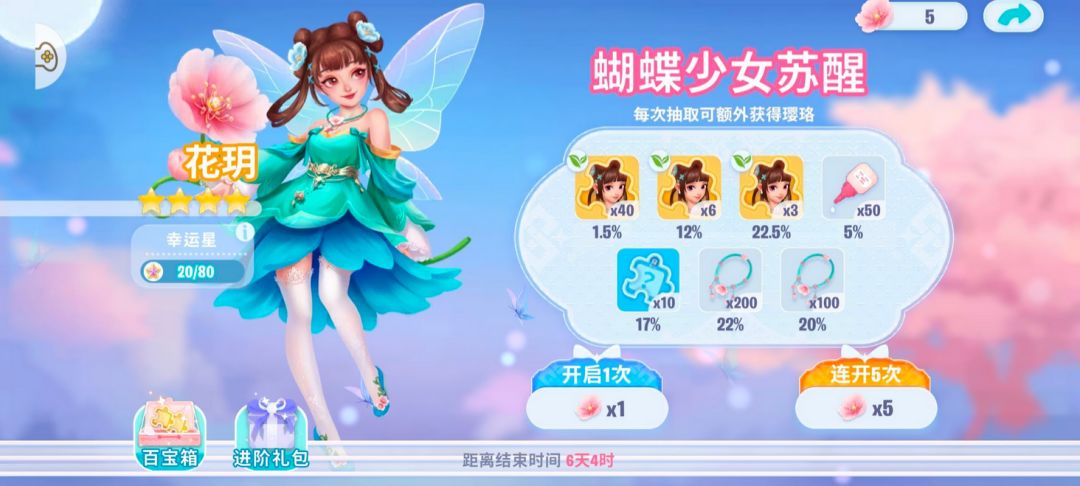 抽卡:花玥的活动专属卡池,可以单抽可以五连抽。