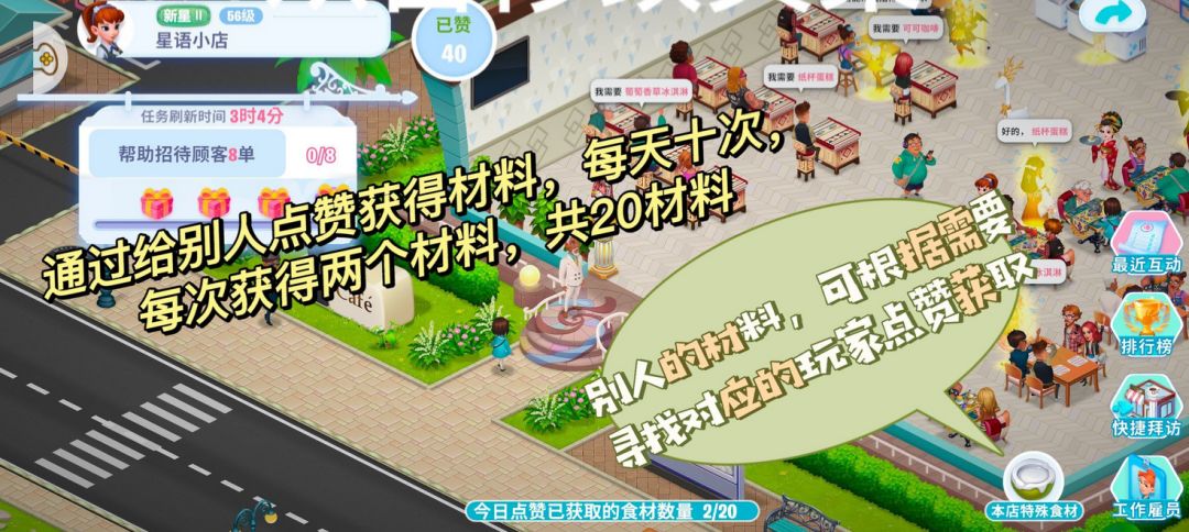 每天还可以通过给别人点赞获得特殊材料,每间店铺都有自己的特殊材料。