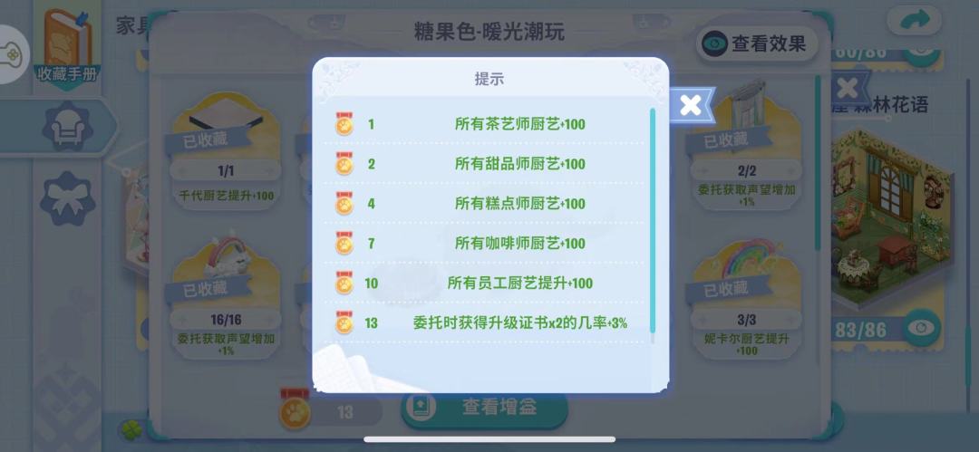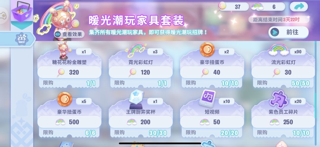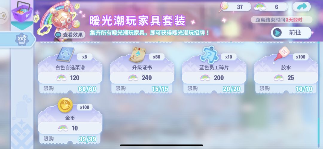 家具可以解锁收藏图鉴,增加员工厨艺,就算不拿满整套家具,参加活动免费拿几件价格比较低的家具解锁图鉴也是不错的选择。