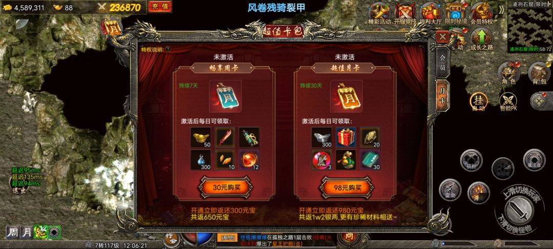 评价:非常推荐购买,每天可以领取的3倍经验卷和内功丹性比价非常高,但是由于前一阵子有一群大聪明,压转生憋等级,出现了一天250级这种情况,所以官方对多倍经验作出了修改,在到达转生指定等级后,无法继续使用多倍经验(系统活动直接发放除外),所以这里建议大家在等级跟不上转生材料收集速度的时候购买周卡