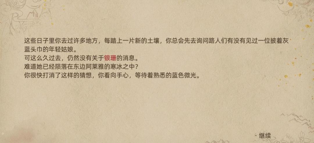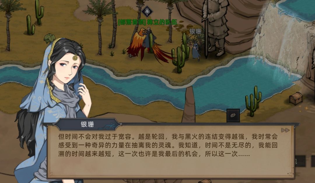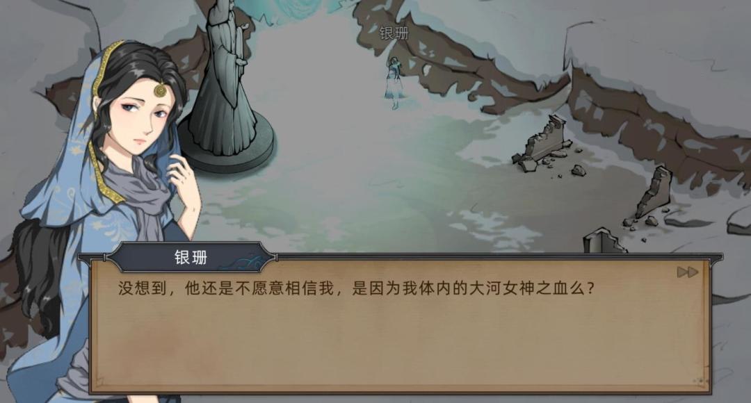 但说不出来,经过一系列主线后(不剧透游戏内容,大家自行体验),男主才得知银珊是大河女神的后辈,拥有和女神一样的时间之力(同时银珊也作为黑火使者存在),虽然银珊非常努力,和火魔打了十世,但最终失败了十世,男主也和银珊一起轮回了十世。