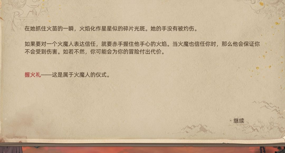 由此可见,火魔部族有少部分热爱和平的火魔,不吃人也能活,同时女火魔让主角给孩子命名——埃尔修斯。后来在部族被大河女神流放后,埃尔修斯为了寻找出路,成为了黑火的第二使者,影响到未来主线。