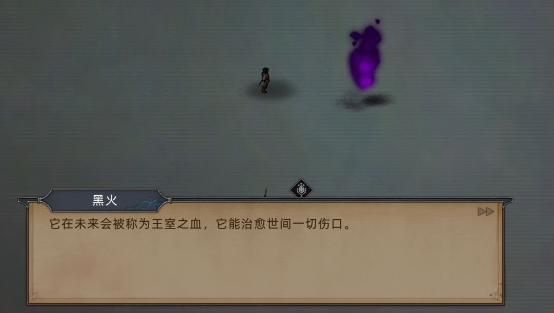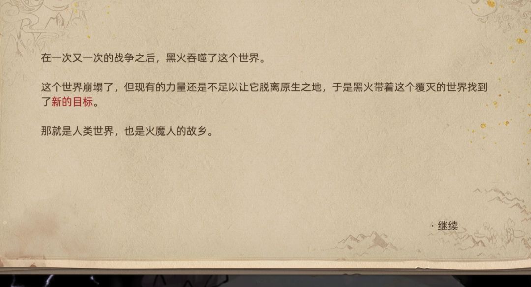 这里向我们讲述了黑火所在的世界面,推测剧情为,火魔被流放过来后,这个世界还未衰退崩坏,但由于火魔人的食物需要魔力,所以和当地原住民发生了冲突,而埃尔修斯作为何平使者,自然是希望部族之间和平共处,于是四处奔波,终于取得了原住民的信任(PS:火魔人没有敌意的时候,手心的火焰才不会伤人,甚至是衣物都不会烧坏),签订了和平条约。