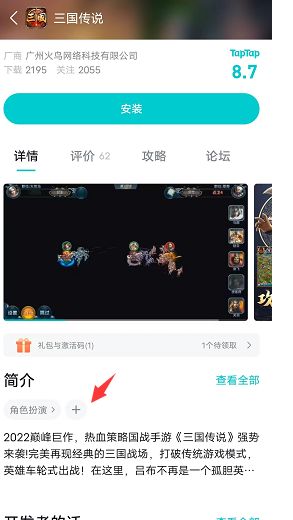 第一步:taptap-《三国传说》,找到【详情-简介】界面的+号,点击进入。