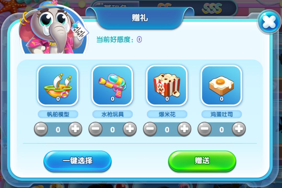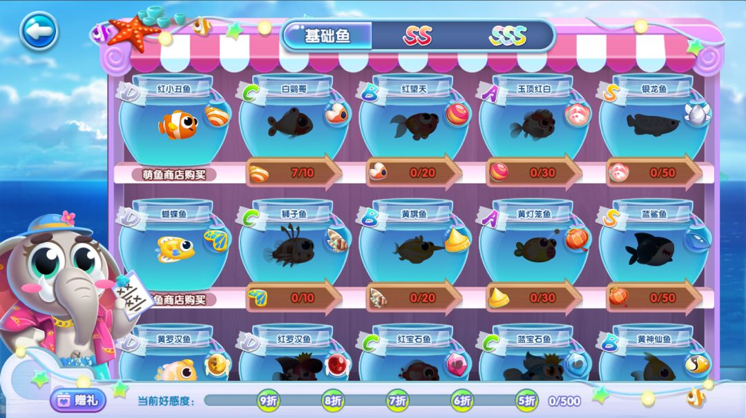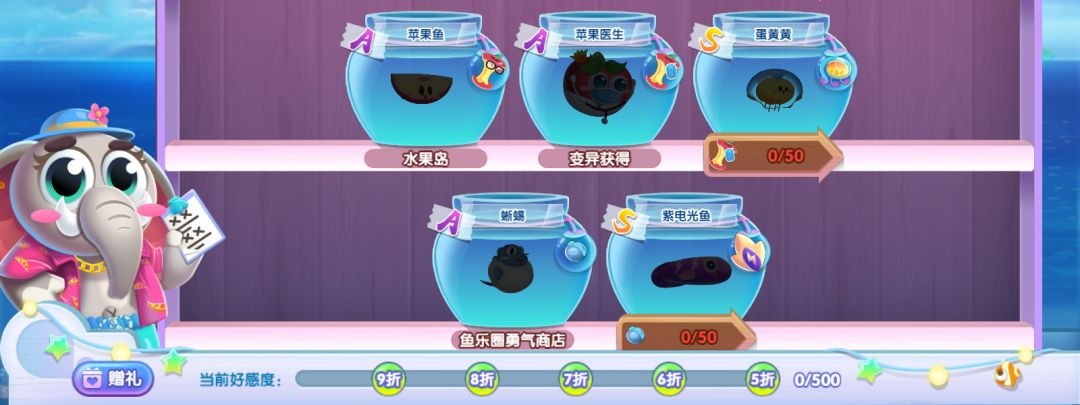 冲浪前不妨先跟大象老板打声招呼呀!听说他为了广交鱼友,特开放了好感度折扣,只需带点赠礼相送,即能增加彼此好感度哦~好感度越多兑换萌鱼享受的折扣就越大!