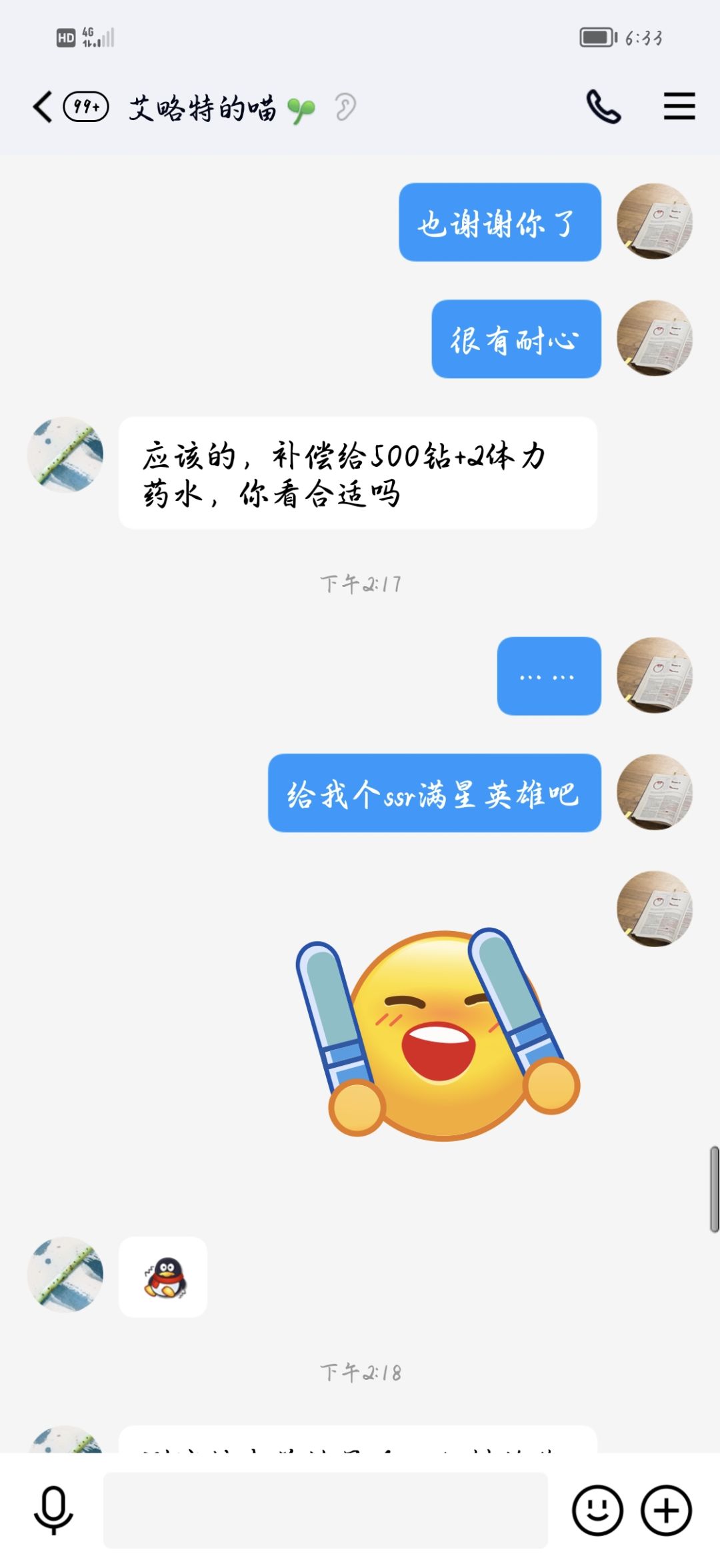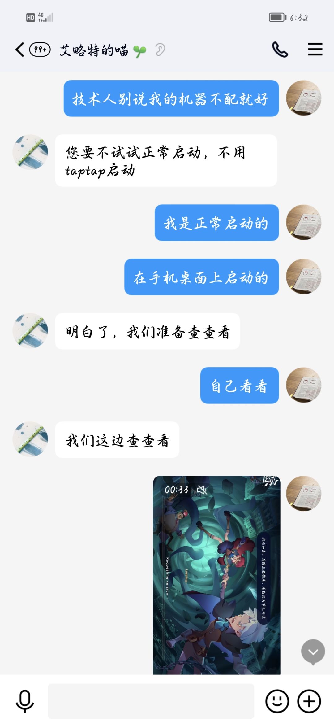 今天上午下载完成,玩了半个小时去给家人准备中午饭,到了1点左右上游戏卡到了游戏界面进不去,我就加了游戏管理QQ管理员很有耐心的用了一个小时的时间处理我遇见的问题,后面可以进游戏了,我玩笑的逗管理员的就当笑话了。