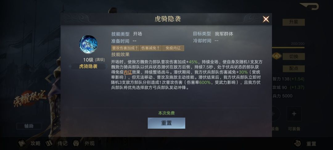 魏*曹纯带自拆两个宝物(考虑到曹纯获取难度较大,虎豹铁凯可替换为开场宝物:孙子兵法,保证敌方第一轮放不出技能,大大增加了队伍存活能力和队伍第一轮的秒杀能力),对伏击的队伍进行了更强大的保护,不至于在潜伏期间武将暴毙,虎豹兵符使得伏击队伍获得对异性伤害加成36%,未伏击的队伍武力伤害减免加成25%,效果还是很强大的。