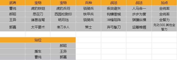 由于曹纯技能的特殊性,会使自身及友方随机一支骑兵伏击到敌方后面,所以站位我们把郝昭放在郭嘉前面,左侧用盾车挡住骑兵。