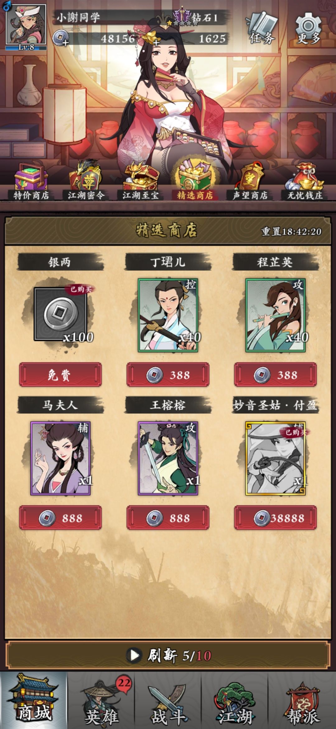 上面这个阵容可以根据自己的辅助情况灵活变通,不怎么推荐虚竹,因为和老张不怎么配合,又拖节奏容易卡牌。