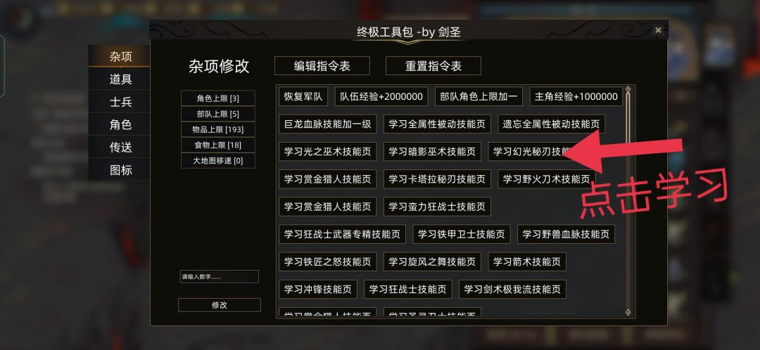 前言:游戏原版除了几种派系巫术能学习外,其他大部分派系技能皆无法正常途径学习,本次通过终极工具包添加指令集来学习所有派系技能页,即可无需更换角色便学会全职业技能,大家可以随心DIY自己喜欢的流派