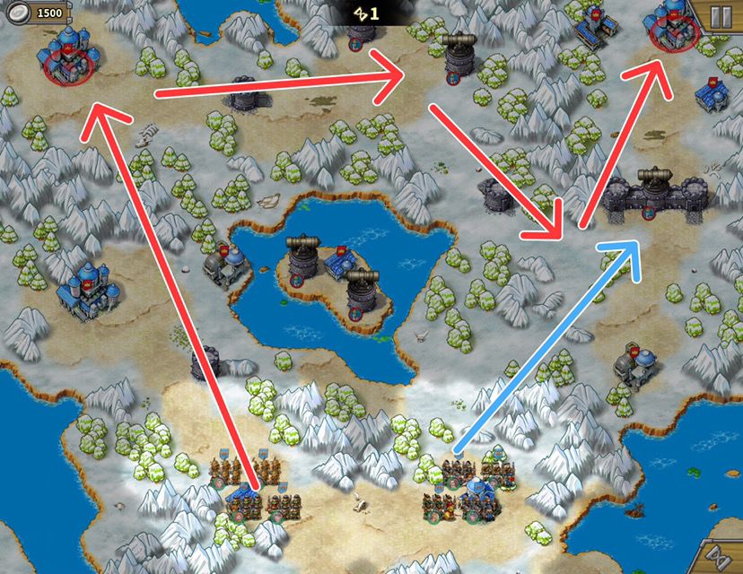开局左边上经济公主,主力沿红线走,二队走蓝线把查理和凯撒慢慢磨死,等主力在中上华盛顿位置时城堡里的黑亚瑟一般都会出来,二队去帮主力一起把黑亚瑟杀死。接着拆城门(城门4000血,炮塔9000血,建议拆城门,城门血少而且炮塔留着叛变后还可以帮忙打几炮)。期间左边工厂一直出炮兵轰左上城堡。最后众人进去杀了拿破仑,破了里面的城堡结束。
