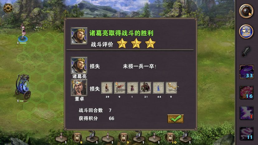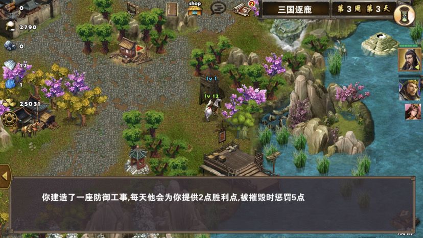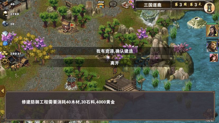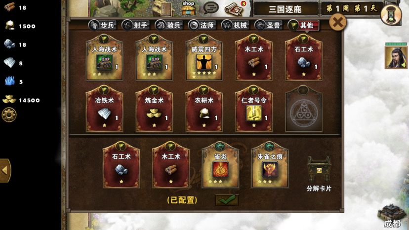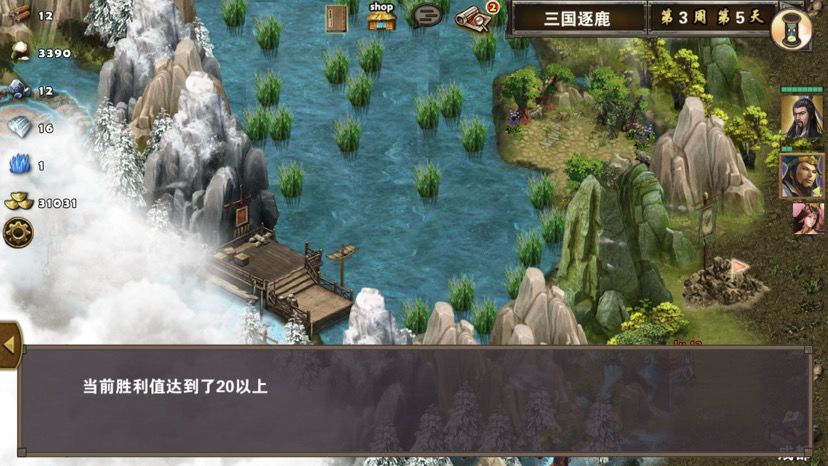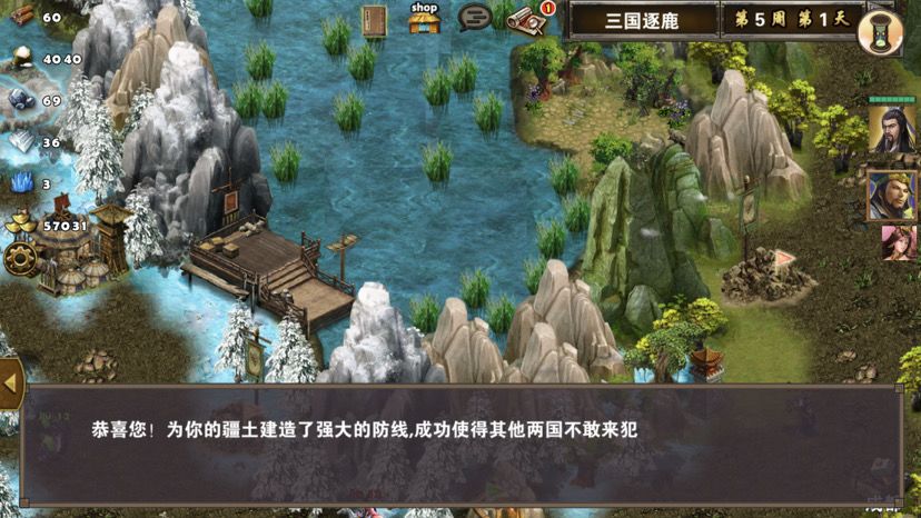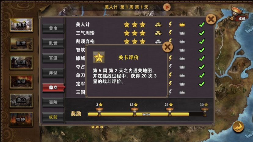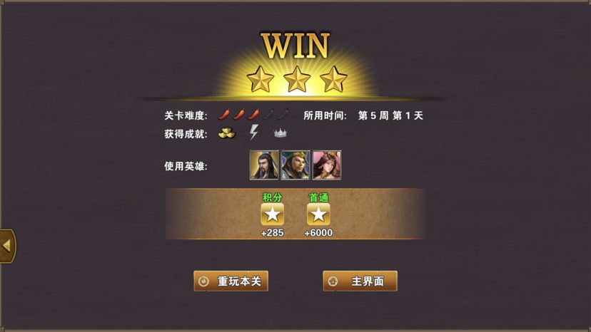 第五章最后一关,难度一般,三国逐鹿顾名思义,三方势力共争天下。三星过关条件是5周2天内通关地图,并在挑战过程中获得20次三星战斗评价,由于我没有购买太史慈、贾诩等英雄,所以选择蜀国,开局刷诸葛亮出战,刘备、诸葛亮装备如图,刘备没有好装备就用雷鸣戒指带着白耳兵打小怪,由于战斗比较频繁所以给诸葛亮准备一套回蓝装备,兵种推荐:朱雀,战术卡推荐:雀炎、朱雀之痕,木工术、石工术,第一天刘备把成都周围资源捡一遍,第二天诸葛亮可以自由行动,两个英雄一起打附近小怪清理一下,占领资源,诸葛亮从码头下水,刘备也下水一起捡资源,第六条貂蝉出现在码头附近,花两个水晶让诸葛亮去招募入伍,然后往右边码头走,先不要上岸,装备不好上去恐怕要挨揍(城内建筑发展朱雀台、府邸、寺庙、翰林院、民居、农场即可,注意成都右边和下面堵路小怪不要打,这样其他势力就不会过来,成都周围有11个小怪打掉后不会刷新,都要无损战斗达成三星战斗评价),过天后诸葛亮上岸往右走,去找曹操战斗,曹操装备有五色石,先把曹操兵打掉,之后轻松打败曹操,获得任务奖励一孔朱雀羽扇,期间吕布、董卓会出现在水里,董卓会被曹操招募,遇见董卓也可以轻松打掉,董卓速度慢,貂蝉控制董卓,诸葛亮打兵,轻松打败董卓获得10点胜利值,然后往下走打小怪,不要打孙权城右边的堵路小怪,不然诸葛亮会被两方势力包围,当然如果装备好有实力可以照打不误,这个时候魏国英雄会一路追击诸葛亮下来,哎,装备不好打不过,躲着点!这个时候刘备可以去成都周围有三处可建造的领地,可以建造防御工事,每个需要40木材30石料4000黄金,木材、石料不够用其他资源换,尽快建成三个防御工事,诸葛亮那边尽快打够20场三星战斗,每个防御工事每天增加2点胜利值,但是如果被敌人打掉会减少5点胜利值,之后诸葛亮在外面专挑弱小boss打,增加胜利值,每打掉一个敌人boss都会增加5点胜利值,当胜利值达到100便会过关!把握好时间,轻松三星过关!附图,说明一下三方势力除了各自主公外,其他英雄都是随机出场,选择曹操势力过关后会得到鬼道天书,选择吴、蜀势力打败曹操可以得到一孔朱雀羽扇,只限首次获得。其实这关不用招兵,诸葛亮全程没有去城里拿一兵一卒。