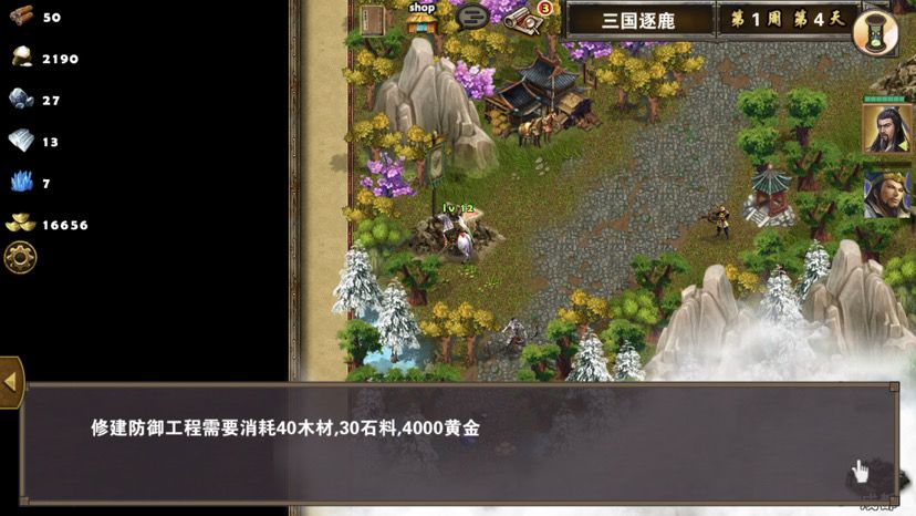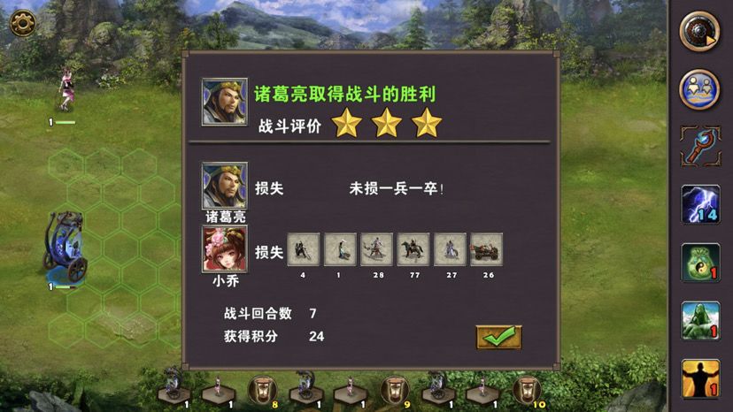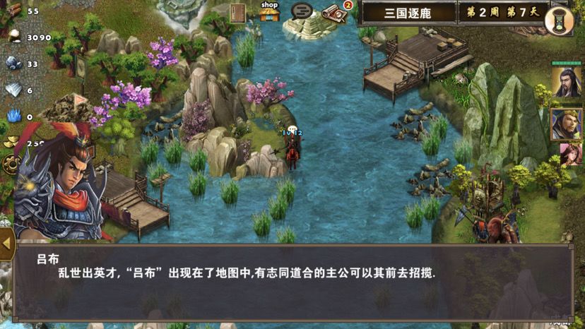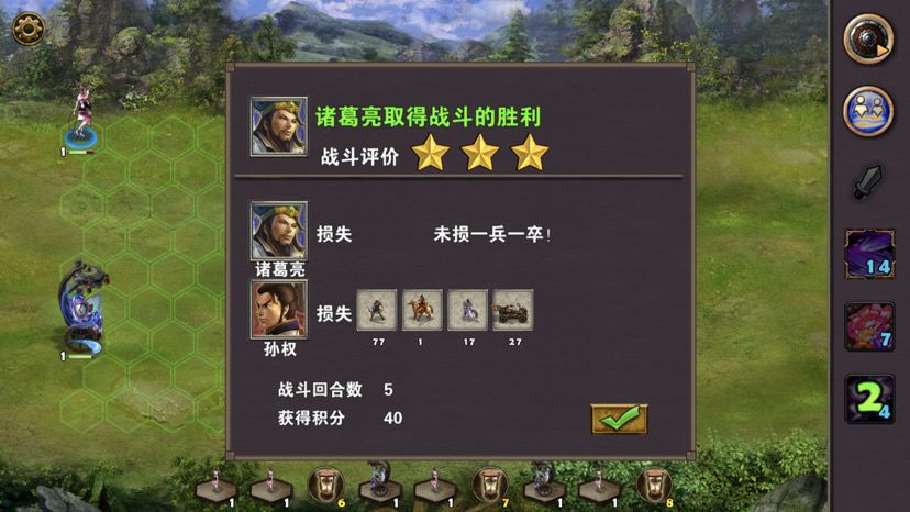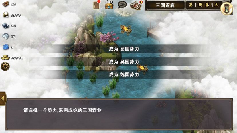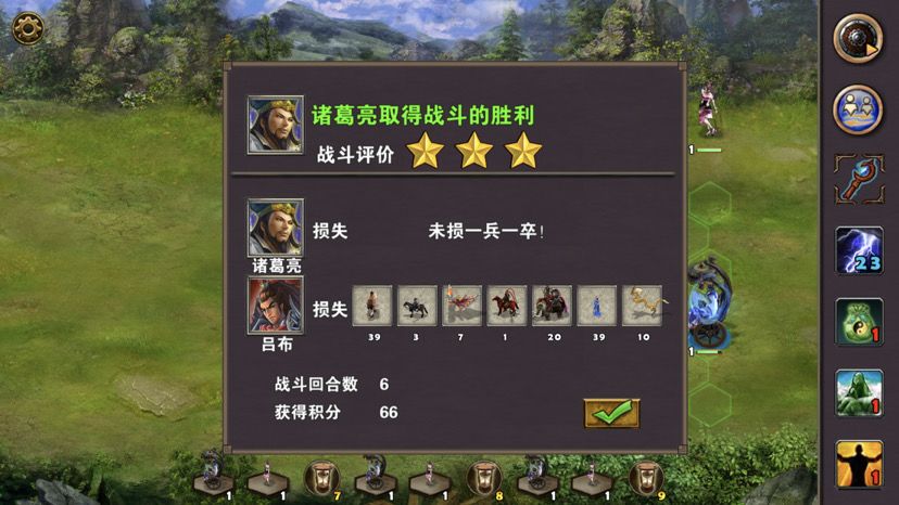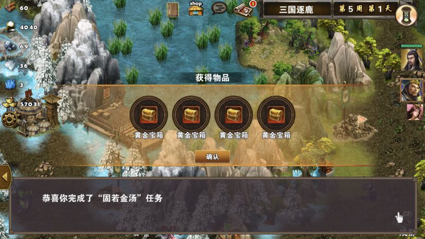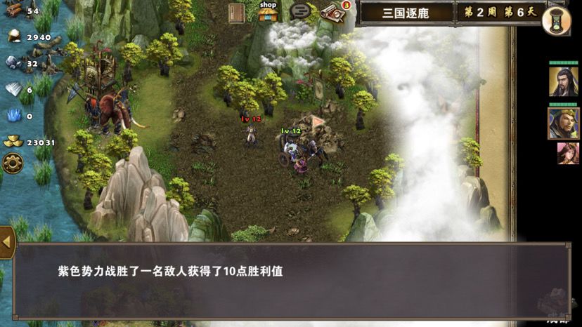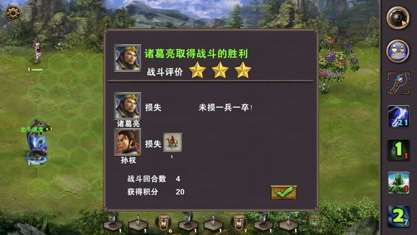 第五章最后一关,难度一般,三国逐鹿顾名思义,三方势力共争天下。三星过关条件是5周2天内通关地图,并在挑战过程中获得20次三星战斗评价,由于我没有购买太史慈、贾诩等英雄,所以选择蜀国,开局刷诸葛亮出战,刘备、诸葛亮装备如图,刘备没有好装备就用雷鸣戒指带着白耳兵打小怪,由于战斗比较频繁所以给诸葛亮准备一套回蓝装备,兵种推荐:朱雀,战术卡推荐:雀炎、朱雀之痕,木工术、石工术,第一天刘备把成都周围资源捡一遍,第二天诸葛亮可以自由行动,两个英雄一起打附近小怪清理一下,占领资源,诸葛亮从码头下水,刘备也下水一起捡资源,第六条貂蝉出现在码头附近,花两个水晶让诸葛亮去招募入伍,然后往右边码头走,先不要上岸,装备不好上去恐怕要挨揍(城内建筑发展朱雀台、府邸、寺庙、翰林院、民居、农场即可,注意成都右边和下面堵路小怪不要打,这样其他势力就不会过来,成都周围有11个小怪打掉后不会刷新,都要无损战斗达成三星战斗评价),过天后诸葛亮上岸往右走,去找曹操战斗,曹操装备有五色石,先把曹操兵打掉,之后轻松打败曹操,获得任务奖励一孔朱雀羽扇,期间吕布、董卓会出现在水里,董卓会被曹操招募,遇见董卓也可以轻松打掉,董卓速度慢,貂蝉控制董卓,诸葛亮打兵,轻松打败董卓获得10点胜利值,然后往下走打小怪,不要打孙权城右边的堵路小怪,不然诸葛亮会被两方势力包围,当然如果装备好有实力可以照打不误,这个时候魏国英雄会一路追击诸葛亮下来,哎,装备不好打不过,躲着点!这个时候刘备可以去成都周围有三处可建造的领地,可以建造防御工事,每个需要40木材30石料4000黄金,木材、石料不够用其他资源换,尽快建成三个防御工事,诸葛亮那边尽快打够20场三星战斗,每个防御工事每天增加2点胜利值,但是如果被敌人打掉会减少5点胜利值,之后诸葛亮在外面专挑弱小boss打,增加胜利值,每打掉一个敌人boss都会增加5点胜利值,当胜利值达到100便会过关!把握好时间,轻松三星过关!附图,说明一下三方势力除了各自主公外,其他英雄都是随机出场,选择曹操势力过关后会得到鬼道天书,选择吴、蜀势力打败曹操可以得到一孔朱雀羽扇,只限首次获得。其实这关不用招兵,诸葛亮全程没有去城里拿一兵一卒。