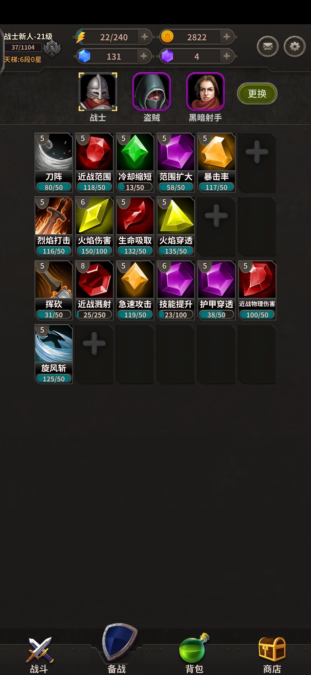 概率提升:宝石&技能的备战等级越高,对战中获取