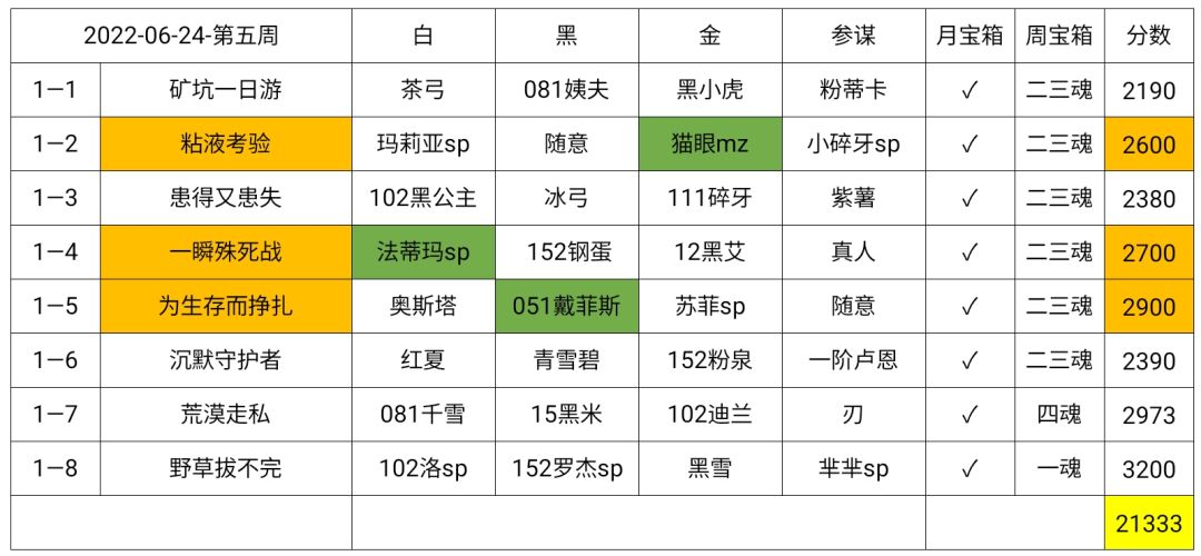 这周的整体分数好像差距不算特别大的样子,除了最优解还有很多阵容都可以不用随便亏几百分的程度。