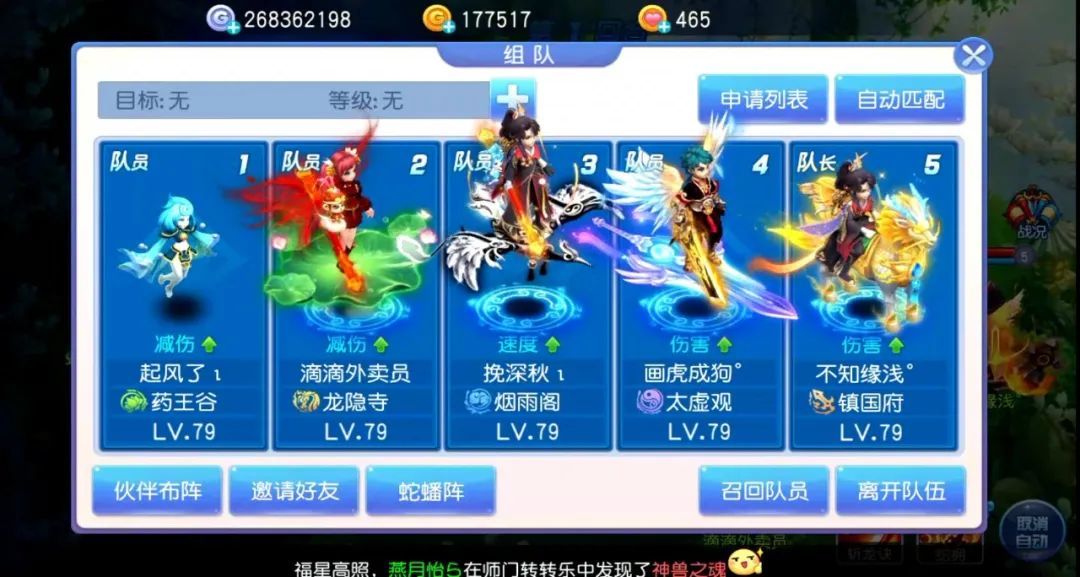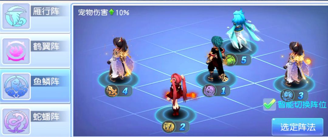 阵法方面我选择的是蛇蟠阵,当然这是因为三辅助的原因,桃花源记内更多的是三输出队伍,那么请选择鱼鳞阵!开局宠物三辅助(轻雪梅灵/小螺仙都可以),两单攻!记得单攻连击宠物不可以带隐身!