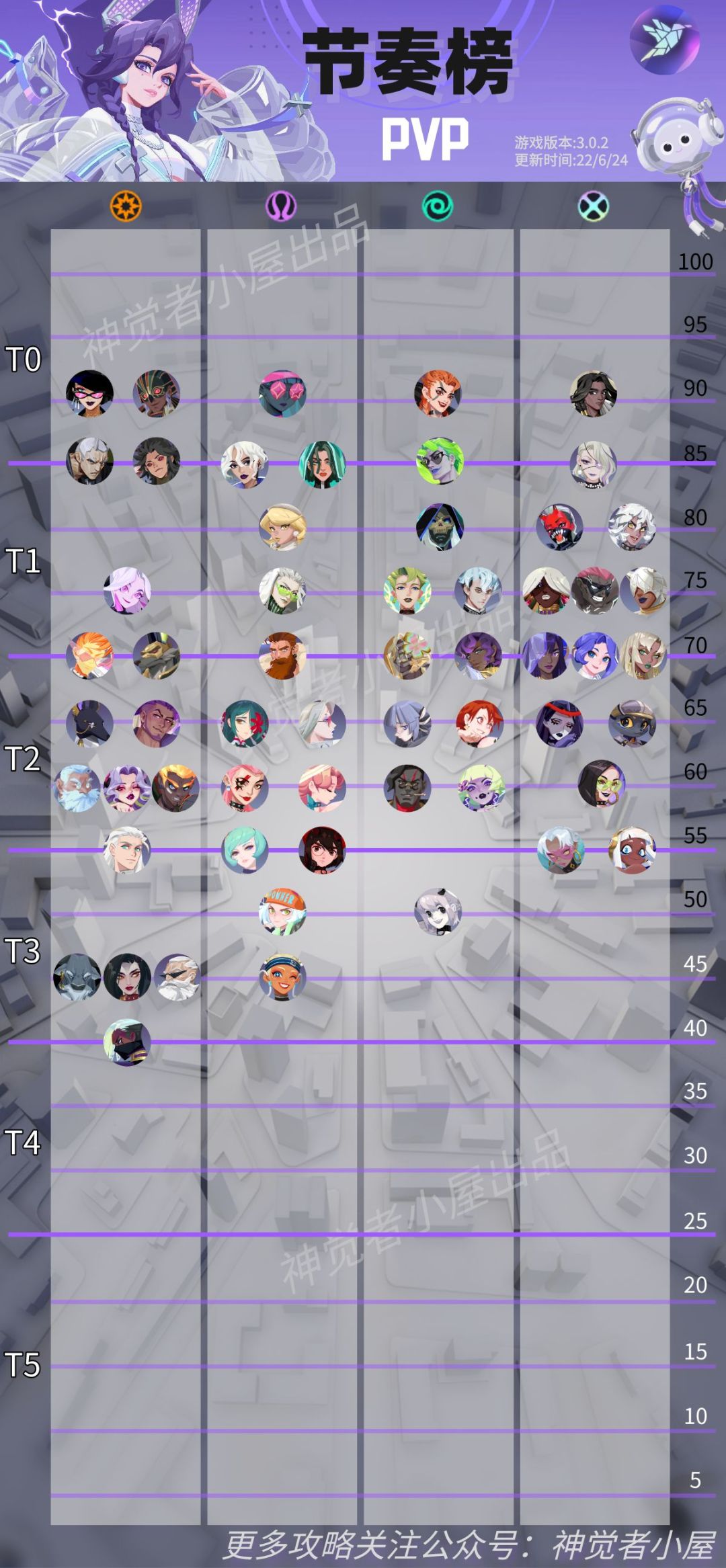 今天给大家带来新版本的全角色节奏榜,本次更新变动不算大,主要是3.0.2版本的新角色以及部分角色调整,本榜单主要由@威威山大王 编制,并吸取了其余几位大佬的建议~