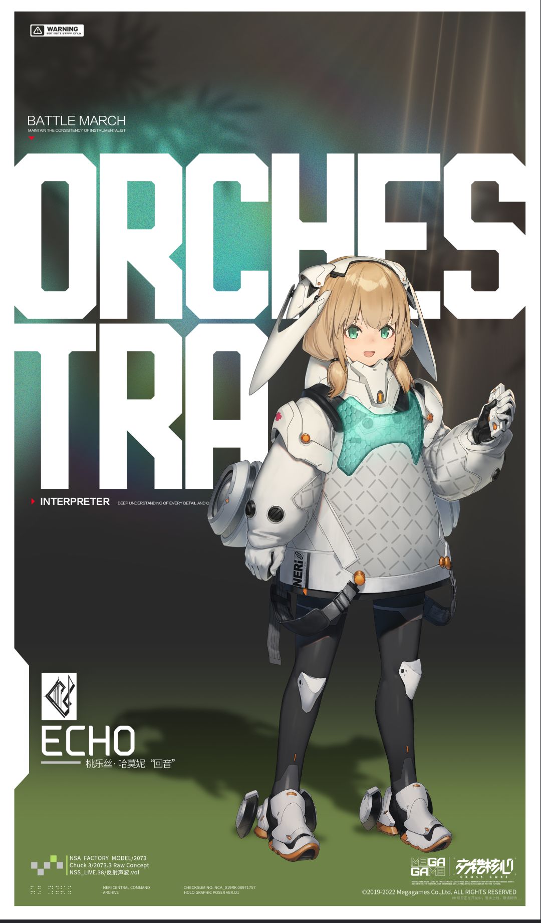 回音,过去曾作为战地医生活跃于地球战场。强大的心理素质赋予了回音即使在危机四伏的环境下,也能摒除杂念,高效精准地进行外科手术的能力,因此得到了NERI维洲支部的推荐加入探索队。性格善良温和的她,作为团队中不可或缺的医务人员,深受队员们的喜爱。