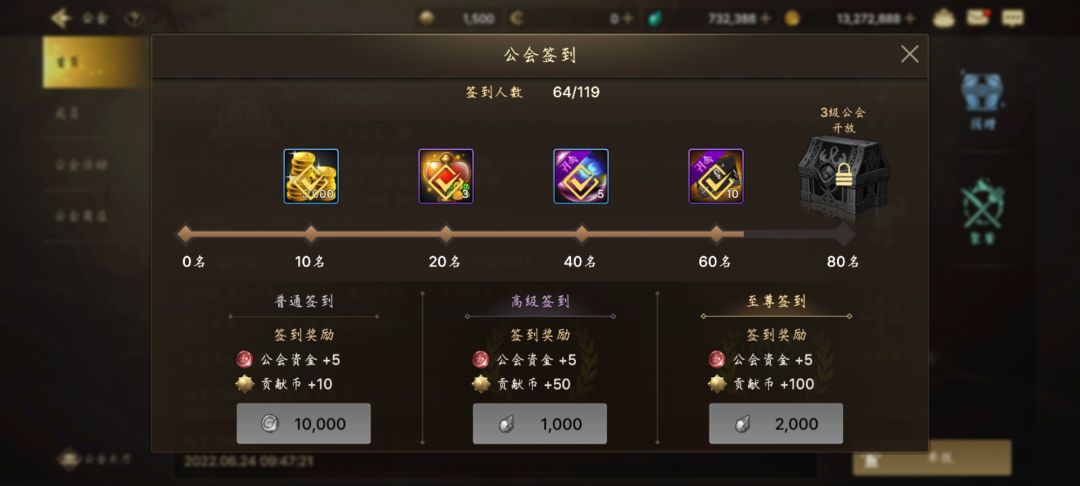 入个二级以上公会签到60人获得十张深渊票在捐献八种材料获得30张深渊票