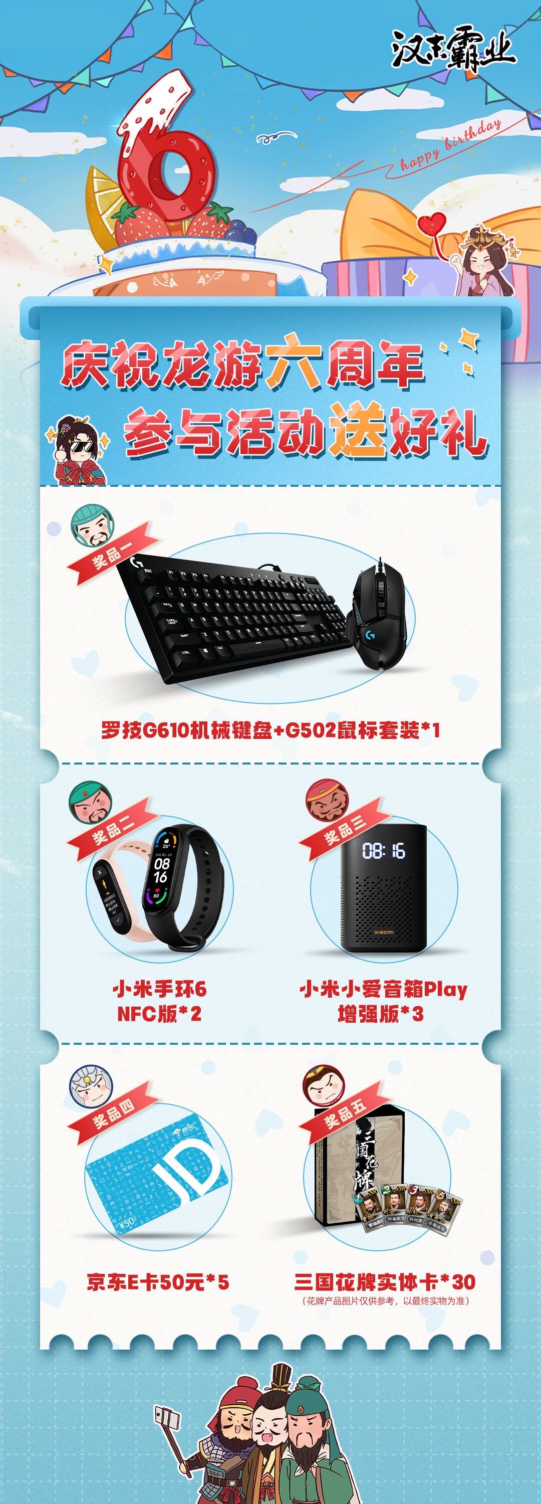 在这里,为了感谢大家一直以来对「龙游天下」及《汉末霸业》的支持,本次周年庆也为大家准备了点心意,参与《汉末霸业》评论就有机会获得机械键盘套装、小米手环、音箱、京东E卡!还有机会获得《手谈九州》花牌的限量实体卡牌哦!