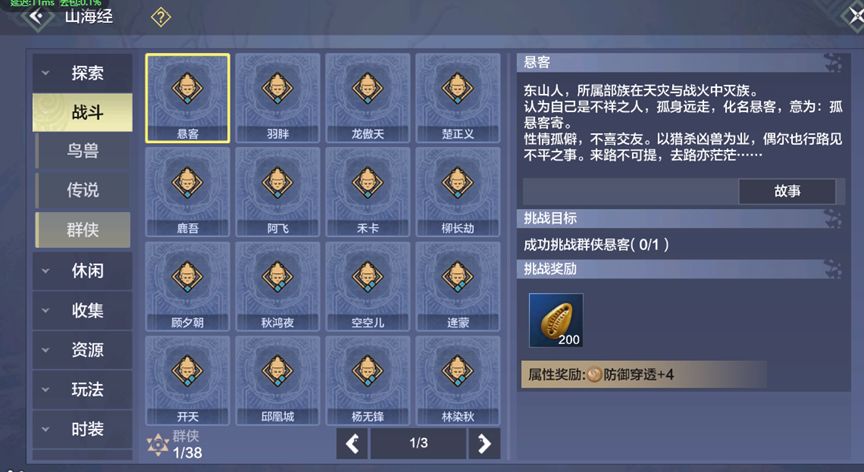 注:部分游侠暂未开放挑战,解释群侠篇所需战力由低到高需要一步一步的来解锁是一个任重道远的游戏玩法,当然也可以组队进行解锁或者加入氏族结识大佬来带你解锁图鉴。