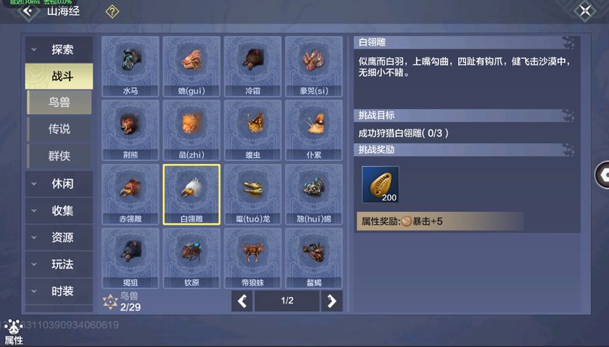 鸟兽篇解锁条件:在大荒世界,北山上寻找指定异兽狩猎达到指定次数解锁。