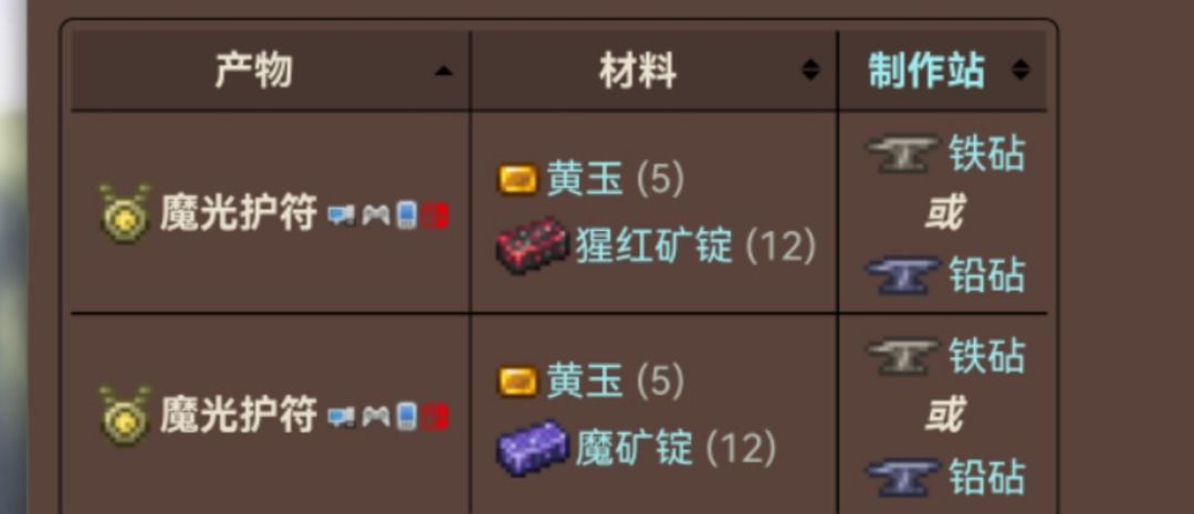 由黄玉,猩红矿锭/魔矿锭在铁砧合成