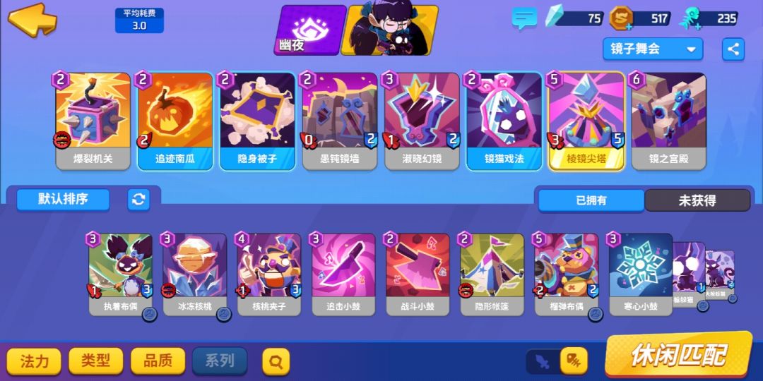 镜猫戏法[2费]:可以在拥有镜子属性上的建筑召唤出一只小躲猫猫。(低达两费的卡牌可以让你拥有一只三费的小躲猫猫,其利益可见一斑。)