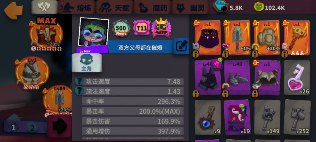 面板攻速不用追求max,因为武器的绑定攻速提升的加成并不在面板上显示,堆到10/1.3=7.692307692攻速就够了,因为鞋子符文未满级,所以还差点。