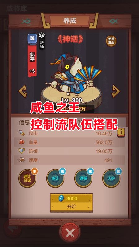面郭嘉,控制流必带武将,挨打有几率冰冻敌人,挂掉还可以有几率控制全体敌人,还能回复全体友军攻击和生命。